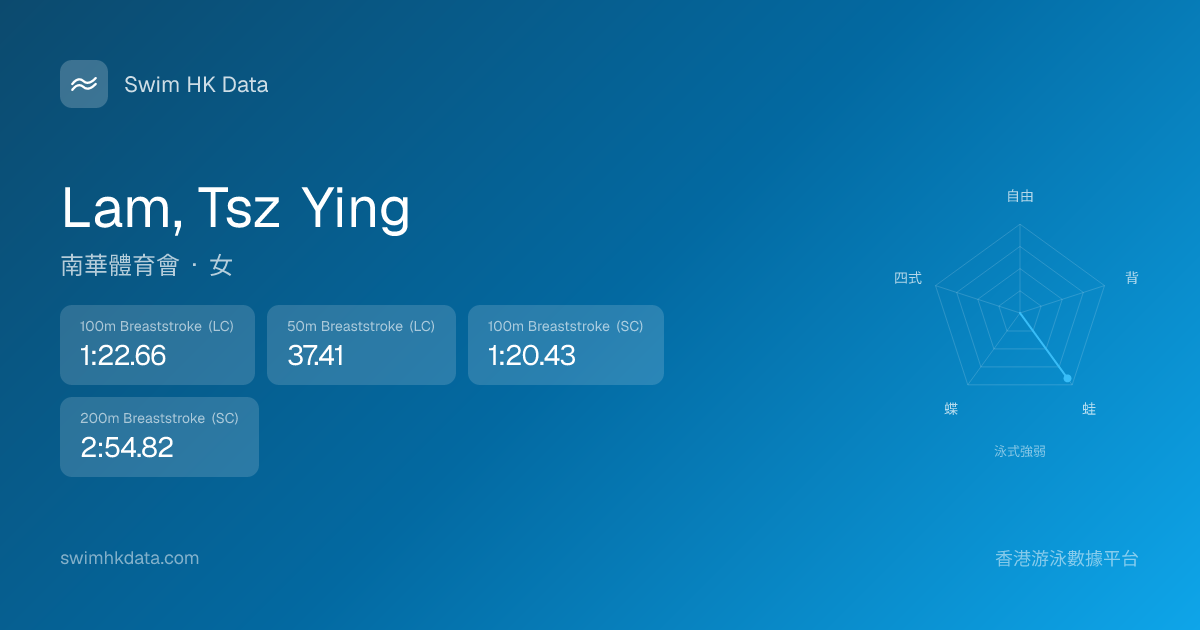 此圖表根據你所有比賽成績計算,顯示你在各泳式的相對強弱,僅供參考。繼續努力,每一次練習都會讓你更快更強!💪