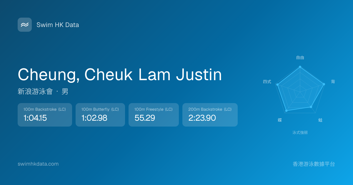 此圖表根據你所有比賽成績計算,顯示你在各泳式的相對強弱,僅供參考。繼續努力,每一次練習都會讓你更快更強!💪