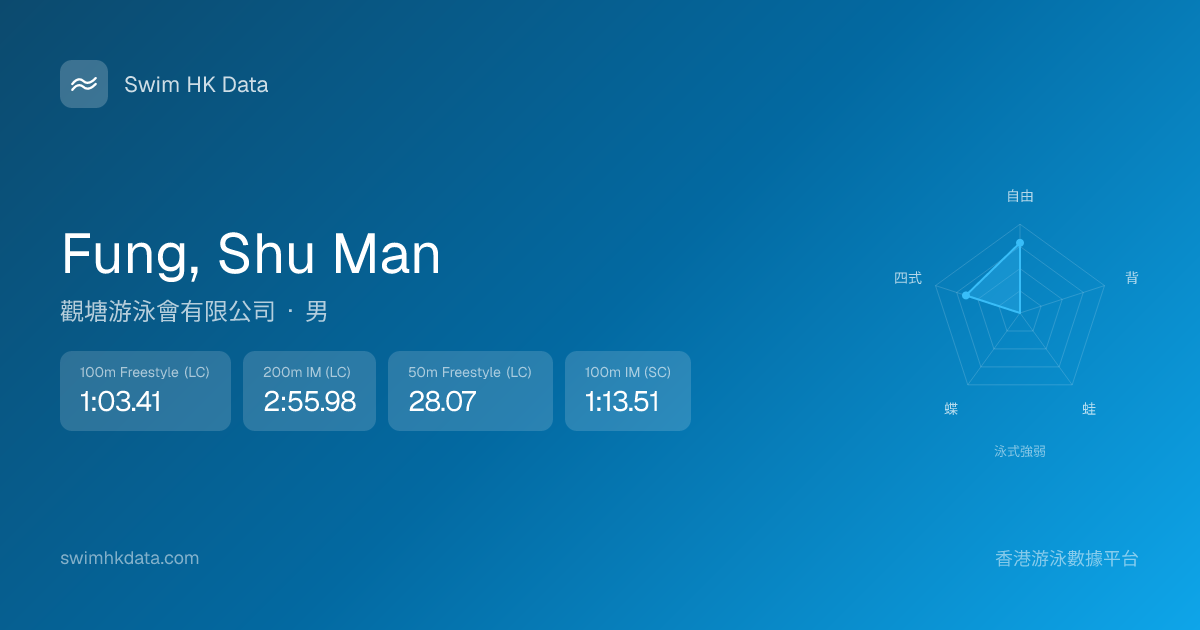此圖表根據你所有比賽成績計算,顯示你在各泳式的相對強弱,僅供參考。繼續努力,每一次練習都會讓你更快更強!💪