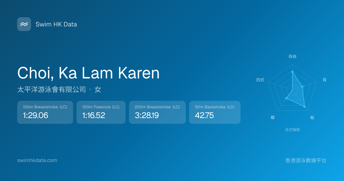 此圖表根據你所有比賽成績計算,顯示你在各泳式的相對強弱,僅供參考。繼續努力,每一次練習都會讓你更快更強!💪