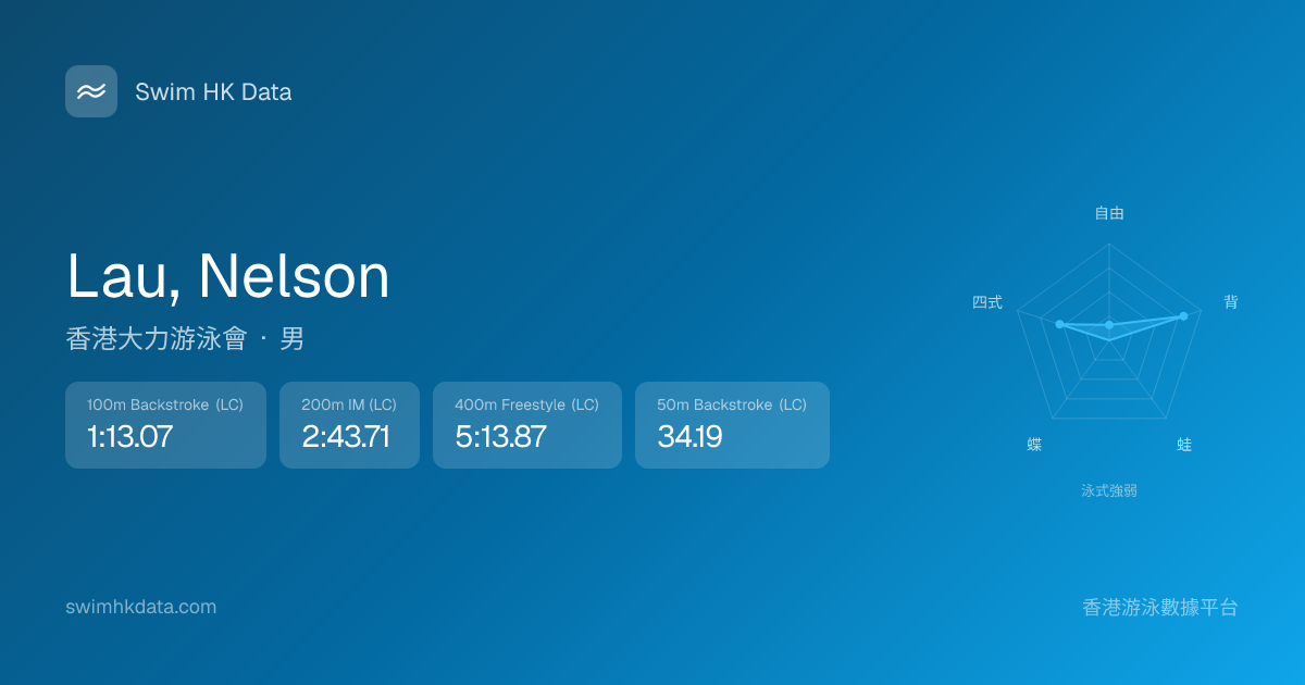 此圖表根據你所有比賽成績計算,顯示你在各泳式的相對強弱,僅供參考。繼續努力,每一次練習都會讓你更快更強!💪