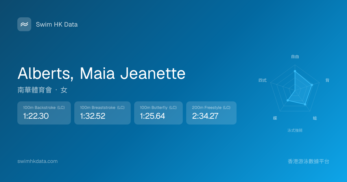 此圖表根據你所有比賽成績計算,顯示你在各泳式的相對強弱,僅供參考。繼續努力,每一次練習都會讓你更快更強!💪