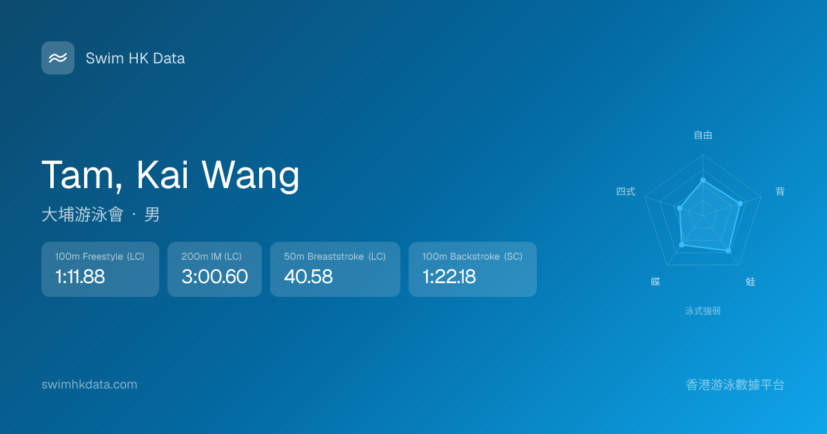 此圖表根據你所有比賽成績計算,顯示你在各泳式的相對強弱,僅供參考。繼續努力,每一次練習都會讓你更快更強!💪