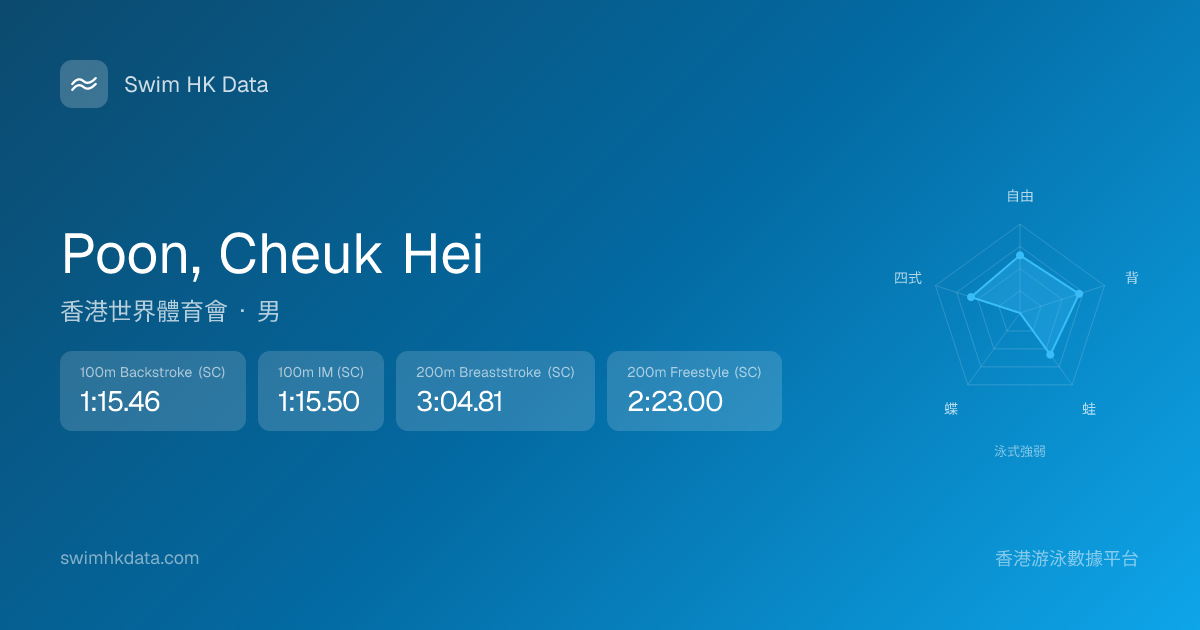 此圖表根據你所有比賽成績計算,顯示你在各泳式的相對強弱,僅供參考。繼續努力,每一次練習都會讓你更快更強!💪