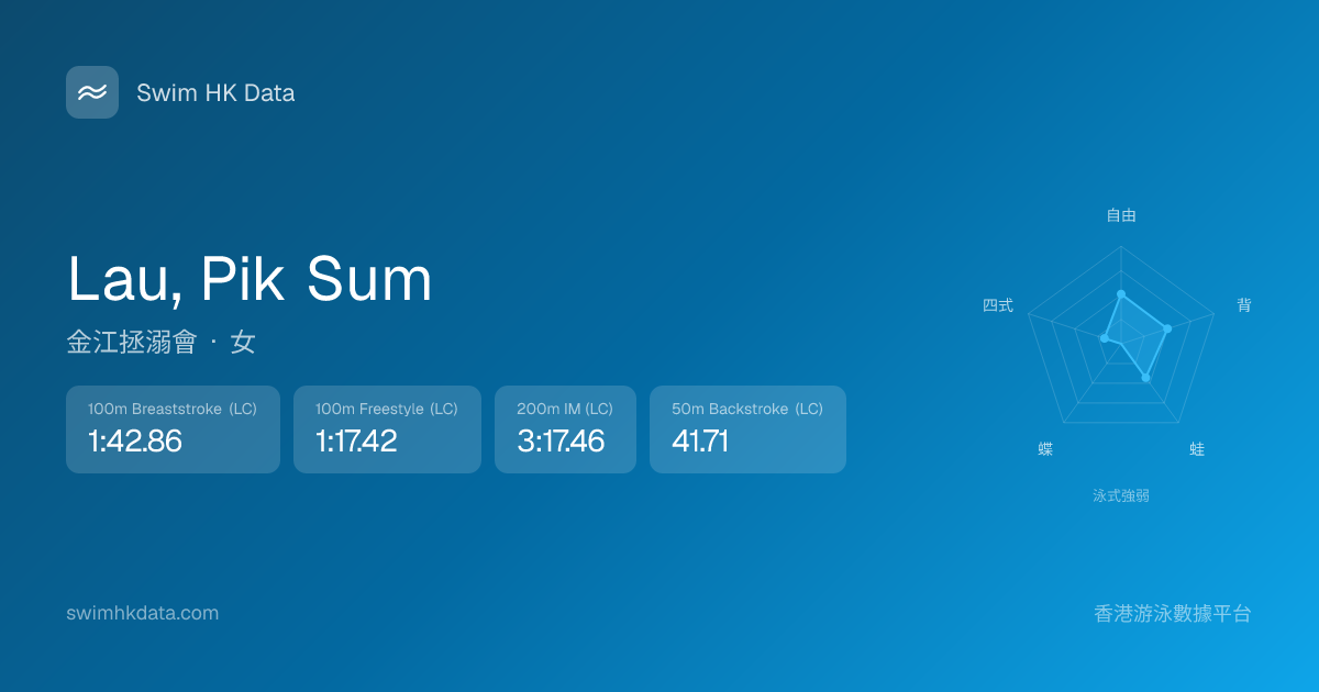 此圖表根據你所有比賽成績計算,顯示你在各泳式的相對強弱,僅供參考。繼續努力,每一次練習都會讓你更快更強!💪
