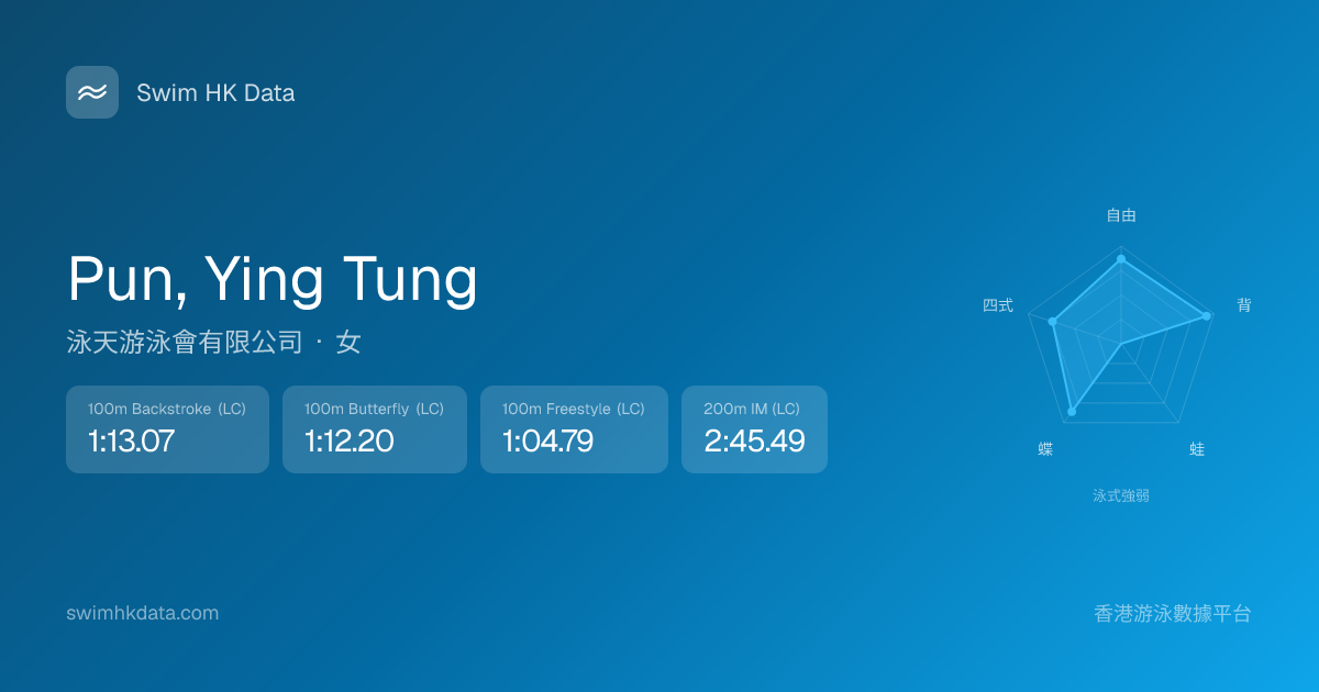 此圖表根據你所有比賽成績計算,顯示你在各泳式的相對強弱,僅供參考。繼續努力,每一次練習都會讓你更快更強!💪