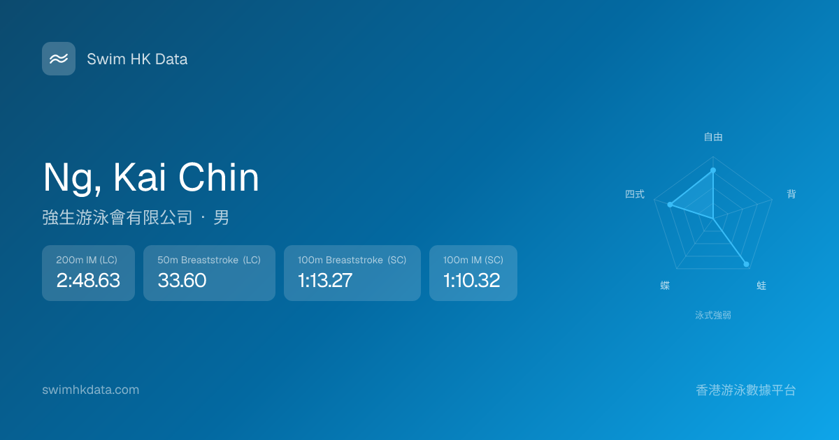 此圖表根據你所有比賽成績計算,顯示你在各泳式的相對強弱,僅供參考。繼續努力,每一次練習都會讓你更快更強!💪