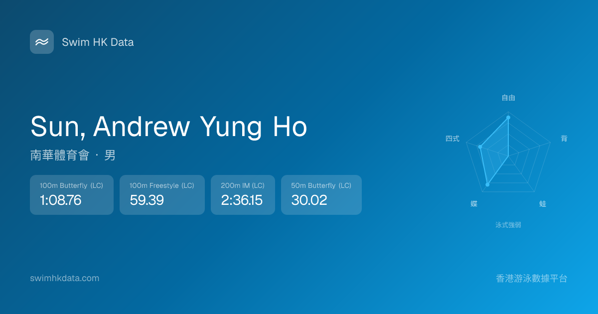 此圖表根據你所有比賽成績計算,顯示你在各泳式的相對強弱,僅供參考。繼續努力,每一次練習都會讓你更快更強!💪