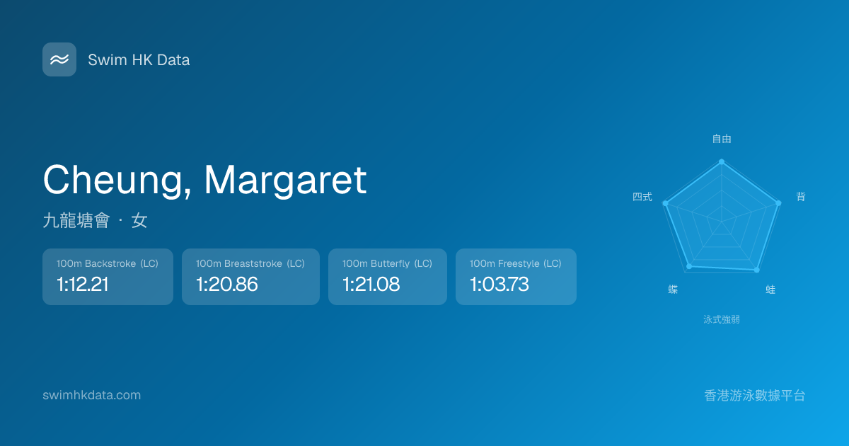 此圖表根據你所有比賽成績計算,顯示你在各泳式的相對強弱,僅供參考。繼續努力,每一次練習都會讓你更快更強!💪