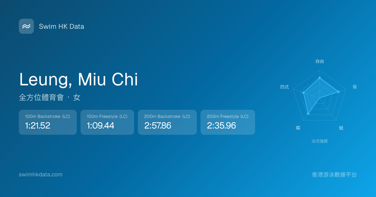 此圖表根據你所有比賽成績計算,顯示你在各泳式的相對強弱,僅供參考。繼續努力,每一次練習都會讓你更快更強!💪
