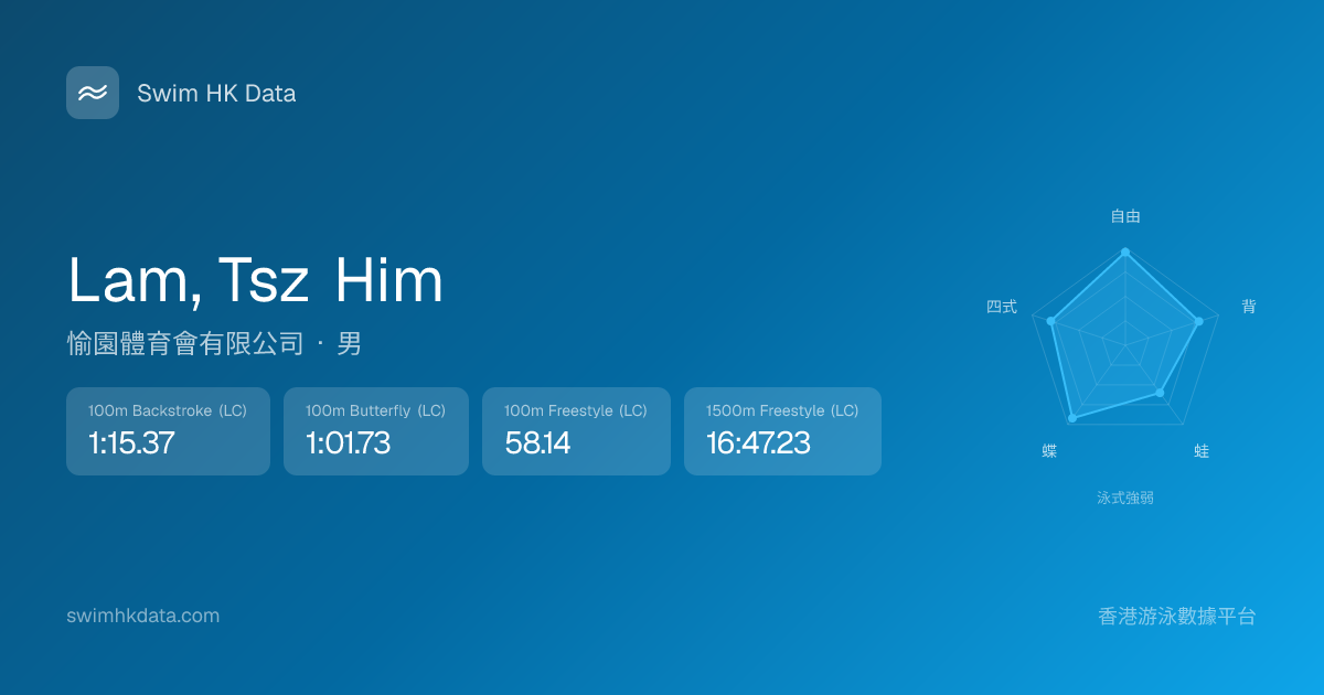 此圖表根據你所有比賽成績計算,顯示你在各泳式的相對強弱,僅供參考。繼續努力,每一次練習都會讓你更快更強!💪