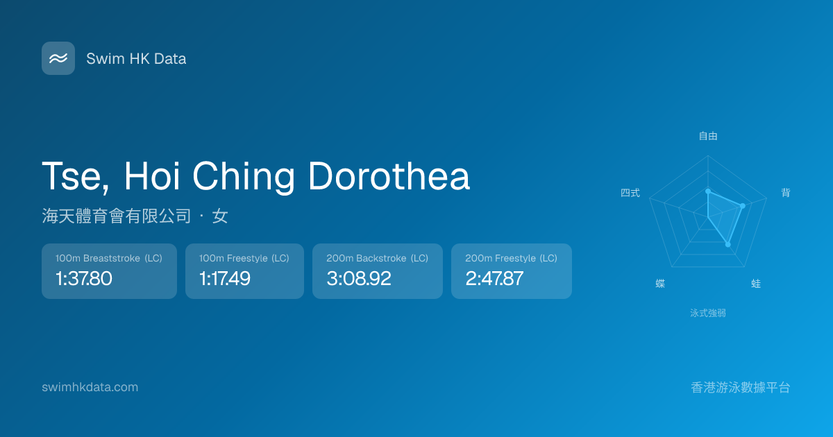 此圖表根據你所有比賽成績計算,顯示你在各泳式的相對強弱,僅供參考。繼續努力,每一次練習都會讓你更快更強!💪