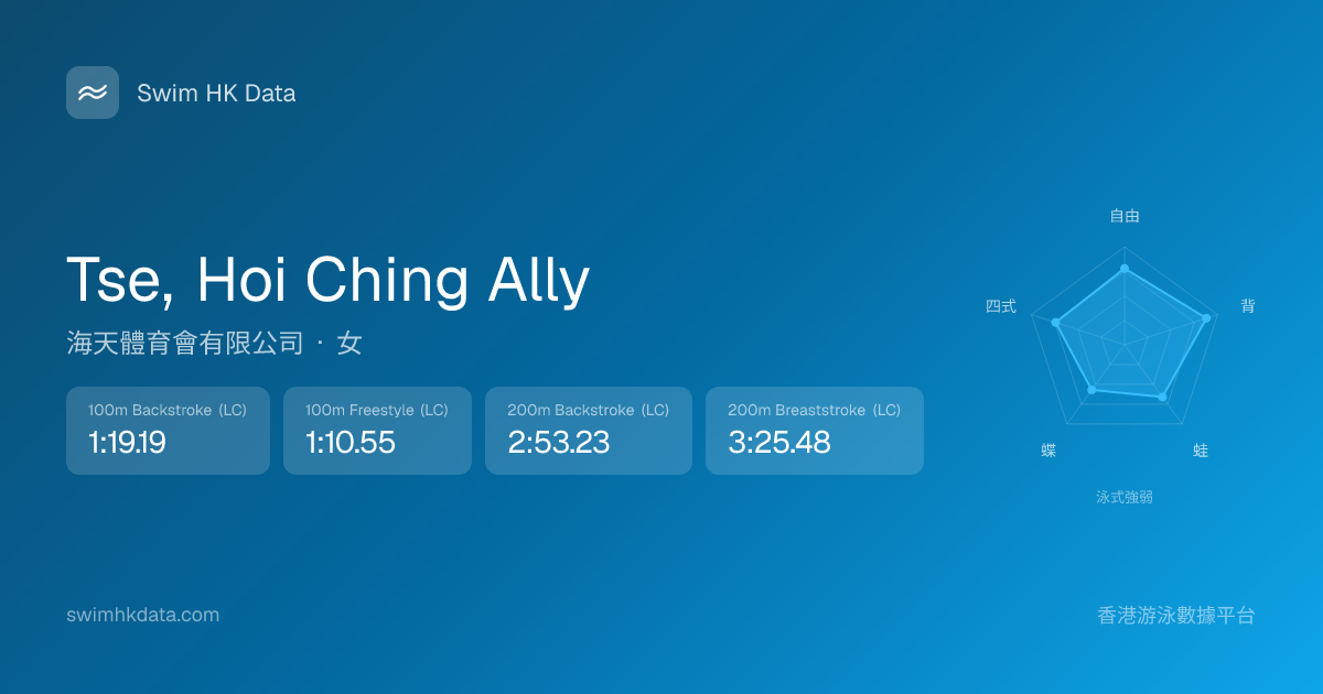 此圖表根據你所有比賽成績計算,顯示你在各泳式的相對強弱,僅供參考。繼續努力,每一次練習都會讓你更快更強!💪
