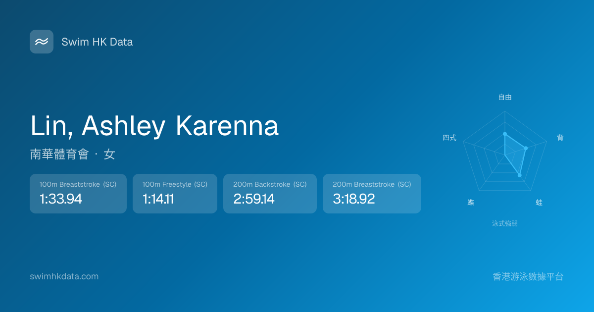 此圖表根據你所有比賽成績計算,顯示你在各泳式的相對強弱,僅供參考。繼續努力,每一次練習都會讓你更快更強!💪