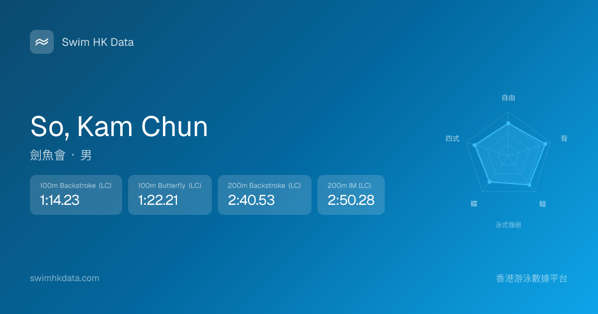 此圖表根據你所有比賽成績計算,顯示你在各泳式的相對強弱,僅供參考。繼續努力,每一次練習都會讓你更快更強!💪