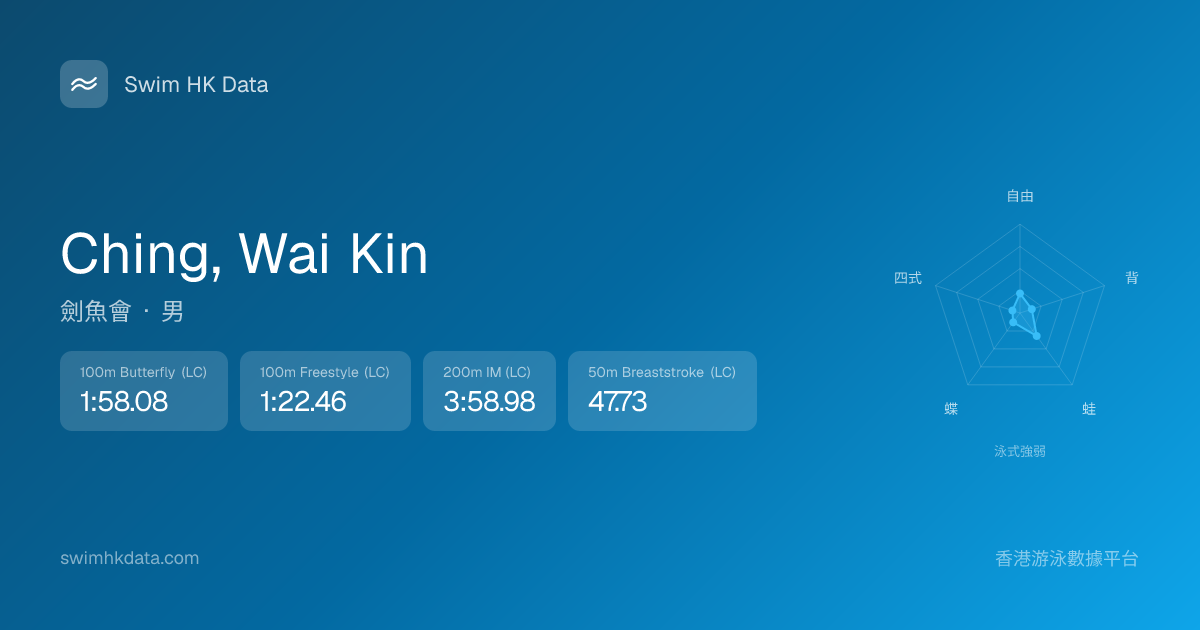 此圖表根據你所有比賽成績計算,顯示你在各泳式的相對強弱,僅供參考。繼續努力,每一次練習都會讓你更快更強!💪