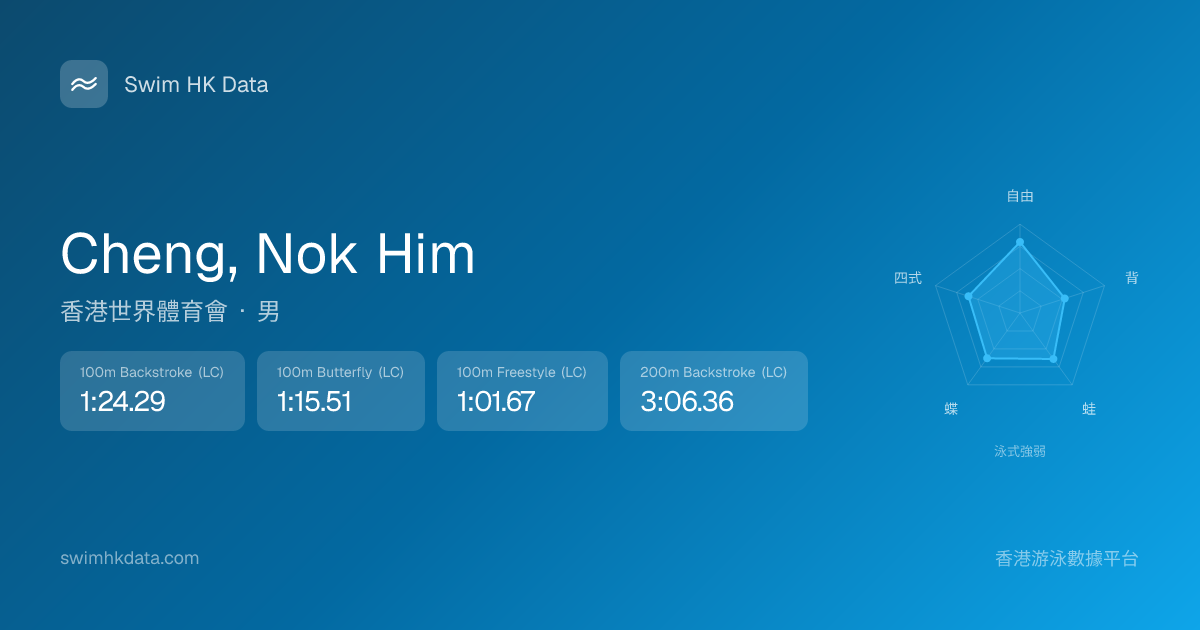 此圖表根據你所有比賽成績計算,顯示你在各泳式的相對強弱,僅供參考。繼續努力,每一次練習都會讓你更快更強!💪