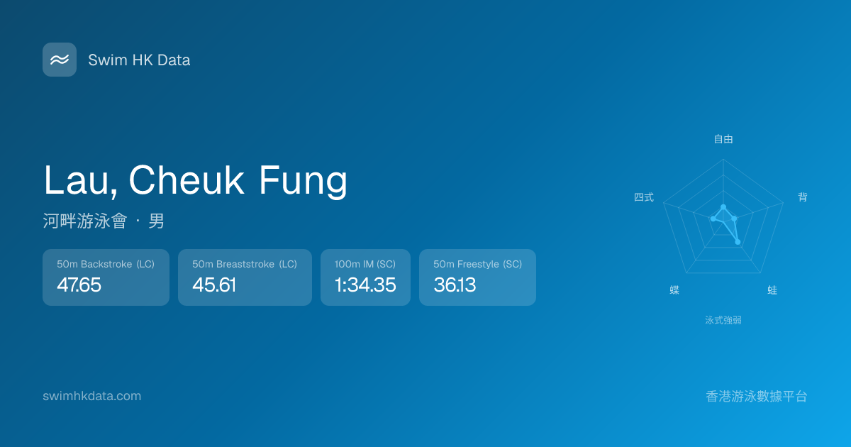 此圖表根據你所有比賽成績計算,顯示你在各泳式的相對強弱,僅供參考。繼續努力,每一次練習都會讓你更快更強!💪