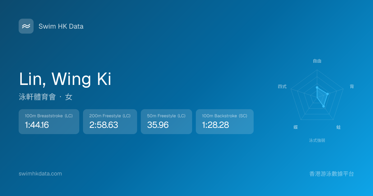 此圖表根據你所有比賽成績計算,顯示你在各泳式的相對強弱,僅供參考。繼續努力,每一次練習都會讓你更快更強!💪