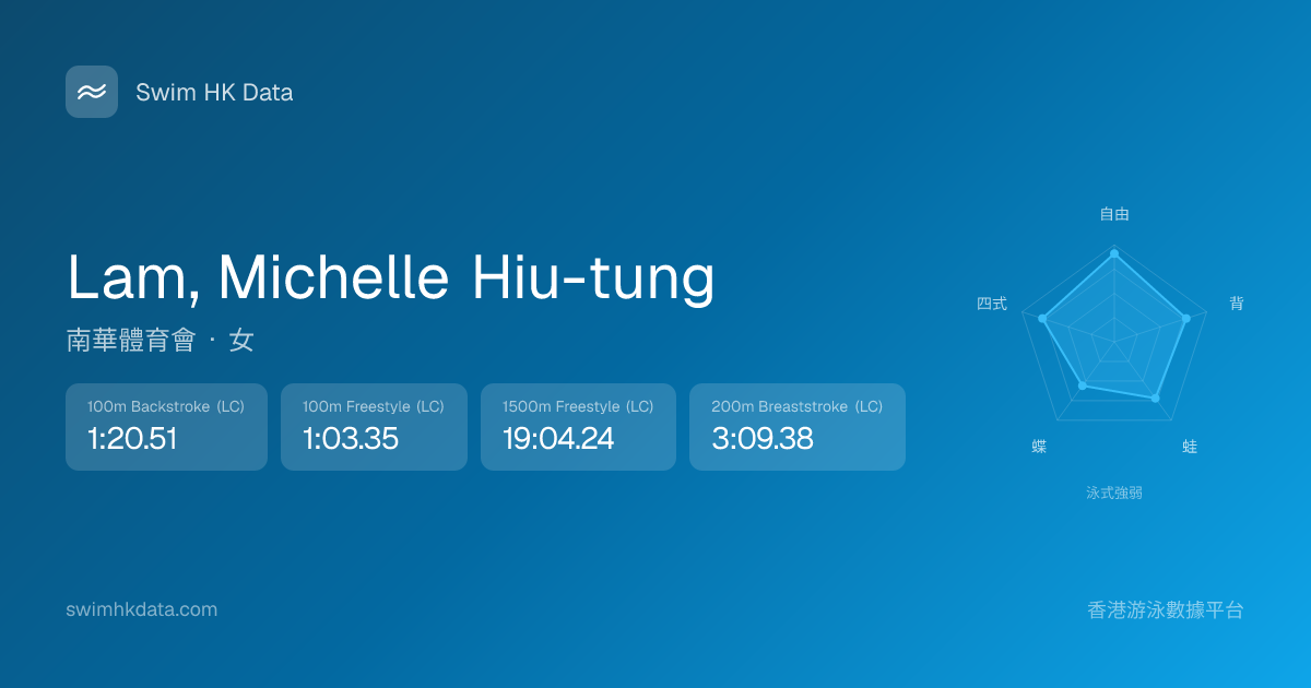 此圖表根據你所有比賽成績計算,顯示你在各泳式的相對強弱,僅供參考。繼續努力,每一次練習都會讓你更快更強!💪