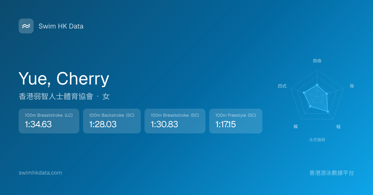 此圖表根據你所有比賽成績計算,顯示你在各泳式的相對強弱,僅供參考。繼續努力,每一次練習都會讓你更快更強!💪