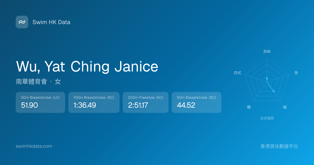 此圖表根據你所有比賽成績計算,顯示你在各泳式的相對強弱,僅供參考。繼續努力,每一次練習都會讓你更快更強!💪