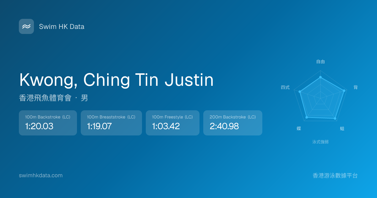 此圖表根據你所有比賽成績計算,顯示你在各泳式的相對強弱,僅供參考。繼續努力,每一次練習都會讓你更快更強!💪