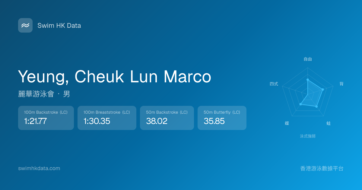此圖表根據你所有比賽成績計算,顯示你在各泳式的相對強弱,僅供參考。繼續努力,每一次練習都會讓你更快更強!💪