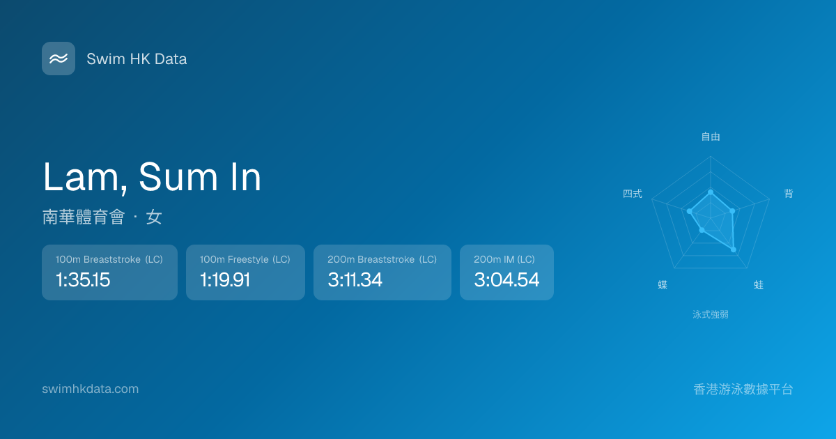 此圖表根據你所有比賽成績計算,顯示你在各泳式的相對強弱,僅供參考。繼續努力,每一次練習都會讓你更快更強!💪