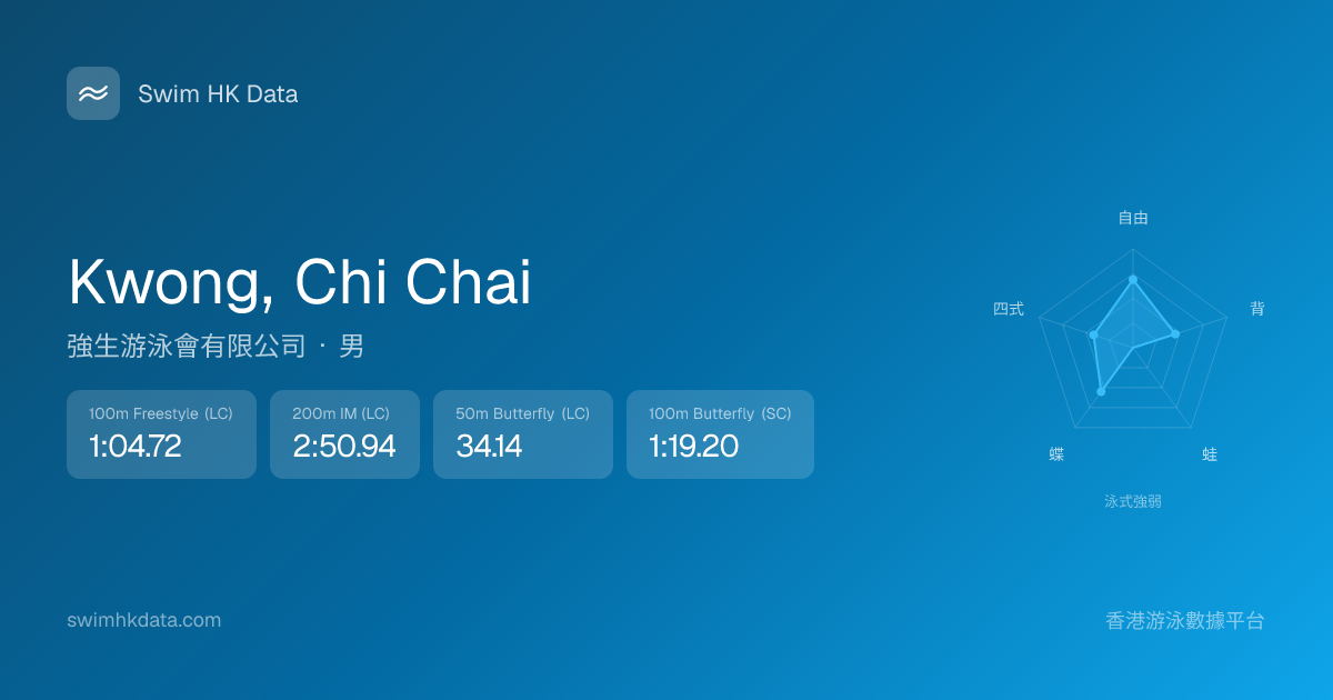 此圖表根據你所有比賽成績計算,顯示你在各泳式的相對強弱,僅供參考。繼續努力,每一次練習都會讓你更快更強!💪