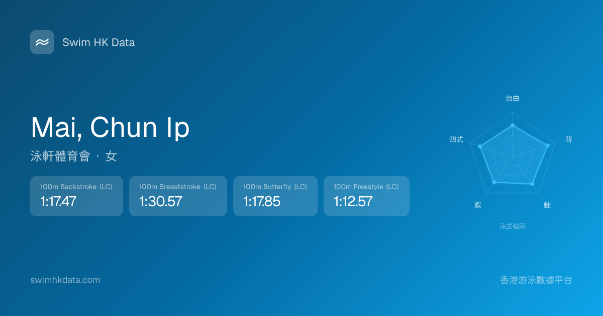 此圖表根據你所有比賽成績計算,顯示你在各泳式的相對強弱,僅供參考。繼續努力,每一次練習都會讓你更快更強!💪