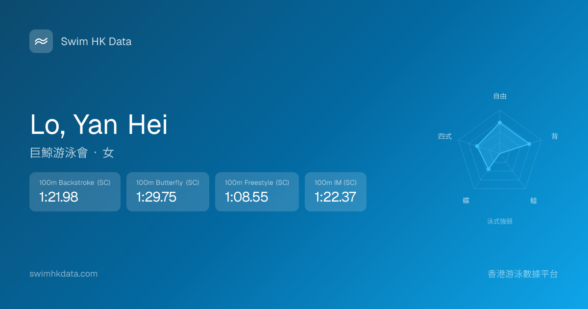 此圖表根據你所有比賽成績計算,顯示你在各泳式的相對強弱,僅供參考。繼續努力,每一次練習都會讓你更快更強!💪