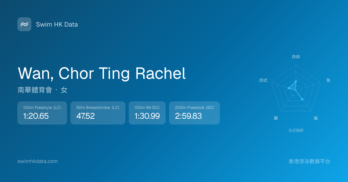 此圖表根據你所有比賽成績計算,顯示你在各泳式的相對強弱,僅供參考。繼續努力,每一次練習都會讓你更快更強!💪