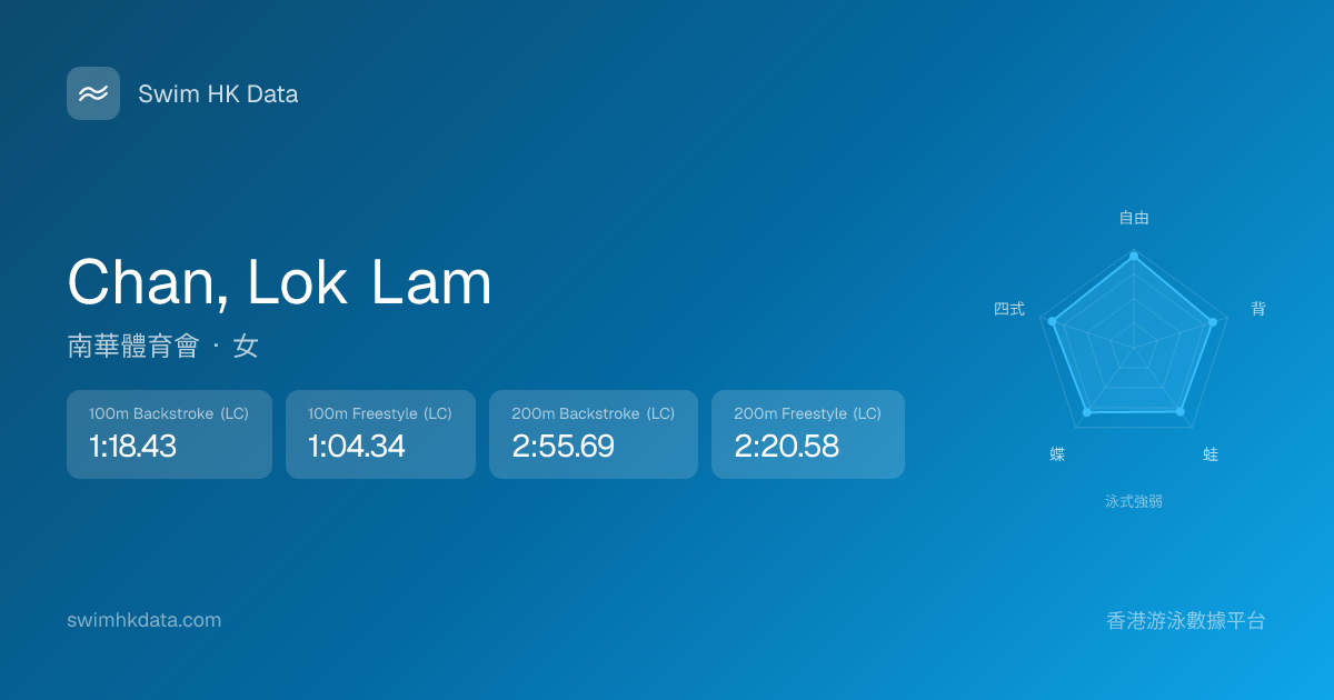 此圖表根據你所有比賽成績計算,顯示你在各泳式的相對強弱,僅供參考。繼續努力,每一次練習都會讓你更快更強!💪
