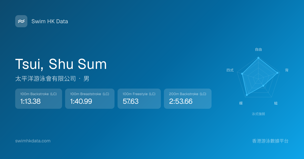 此圖表根據你所有比賽成績計算,顯示你在各泳式的相對強弱,僅供參考。繼續努力,每一次練習都會讓你更快更強!💪