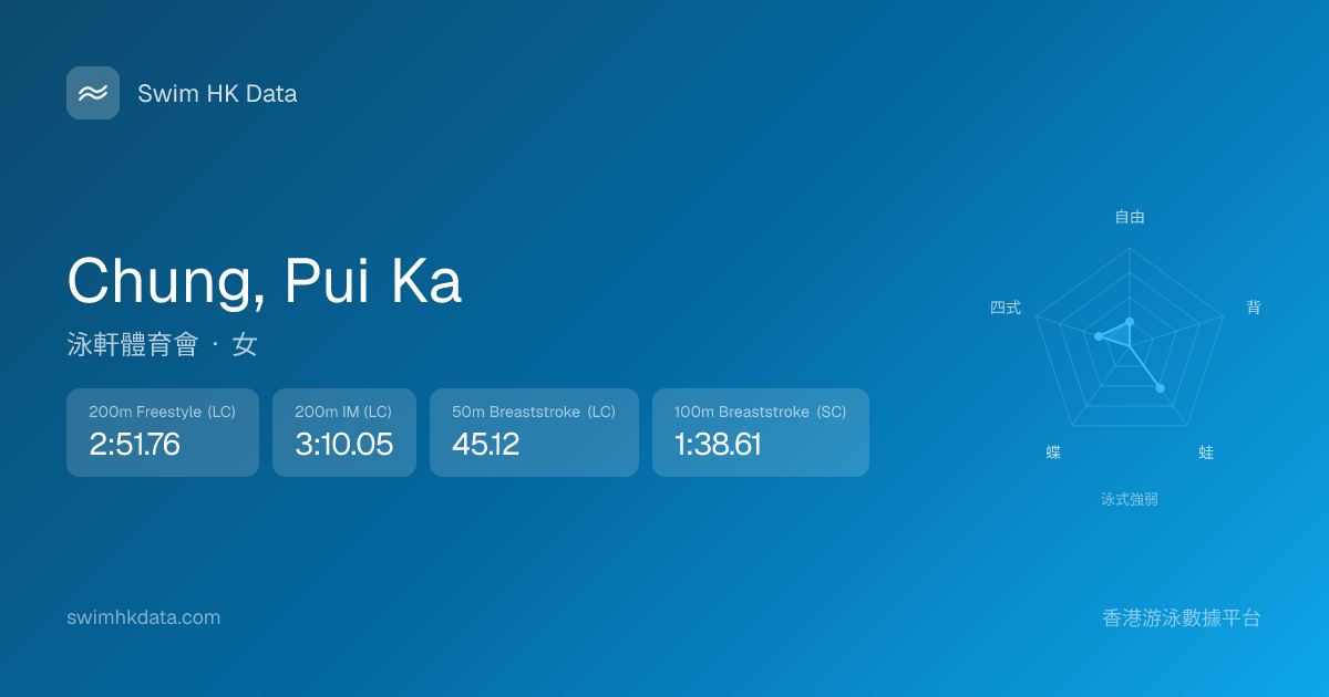 此圖表根據你所有比賽成績計算,顯示你在各泳式的相對強弱,僅供參考。繼續努力,每一次練習都會讓你更快更強!💪