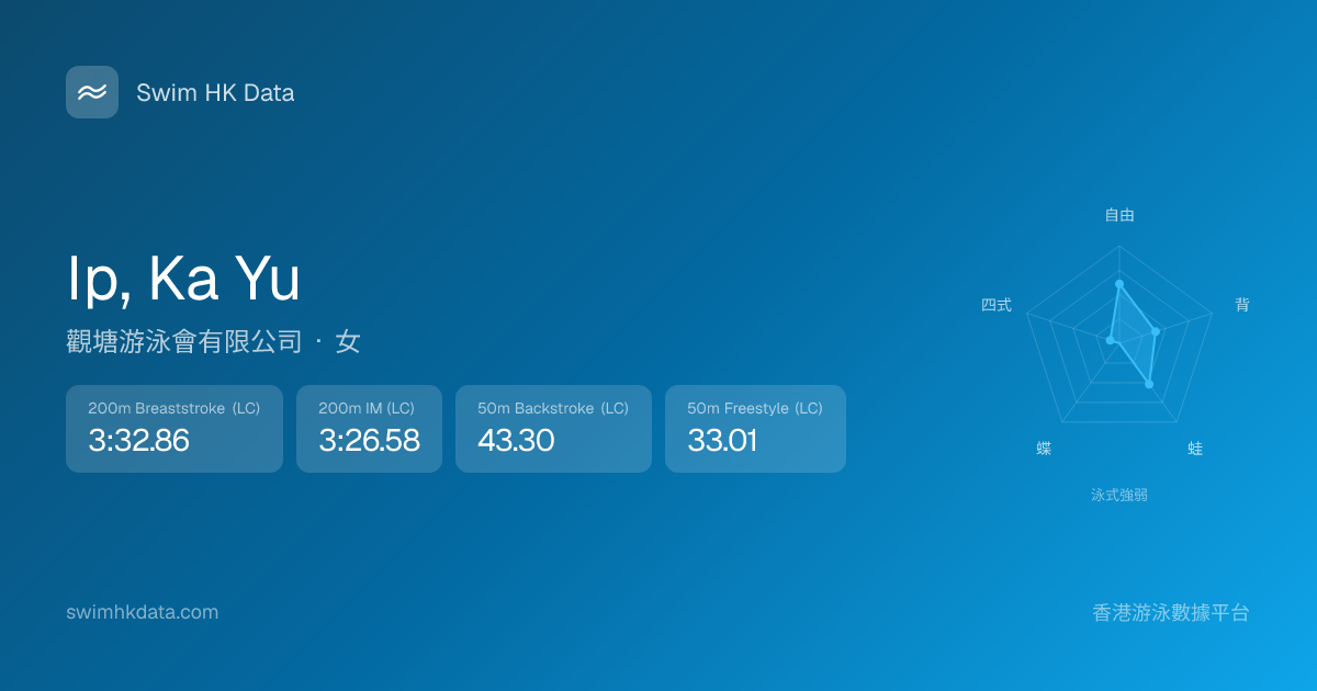 此圖表根據你所有比賽成績計算,顯示你在各泳式的相對強弱,僅供參考。繼續努力,每一次練習都會讓你更快更強!💪