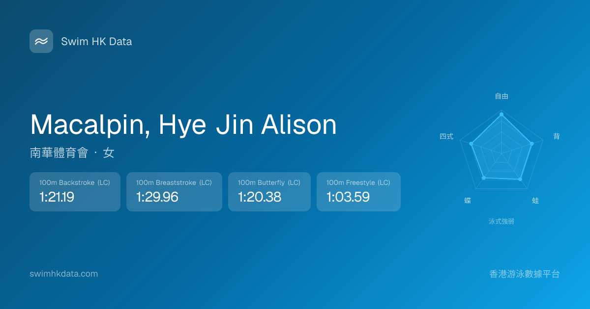 此圖表根據你所有比賽成績計算,顯示你在各泳式的相對強弱,僅供參考。繼續努力,每一次練習都會讓你更快更強!💪