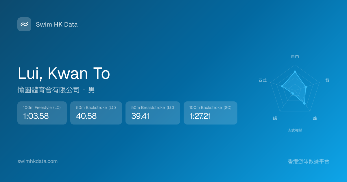 此圖表根據你所有比賽成績計算,顯示你在各泳式的相對強弱,僅供參考。繼續努力,每一次練習都會讓你更快更強!💪