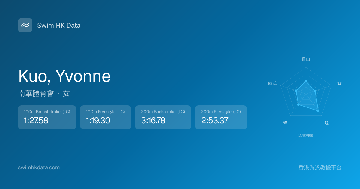 此圖表根據你所有比賽成績計算,顯示你在各泳式的相對強弱,僅供參考。繼續努力,每一次練習都會讓你更快更強!💪