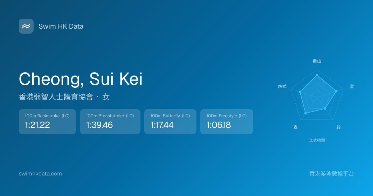 此圖表根據你所有比賽成績計算,顯示你在各泳式的相對強弱,僅供參考。繼續努力,每一次練習都會讓你更快更強!💪