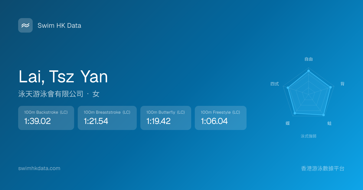 此圖表根據你所有比賽成績計算,顯示你在各泳式的相對強弱,僅供參考。繼續努力,每一次練習都會讓你更快更強!💪