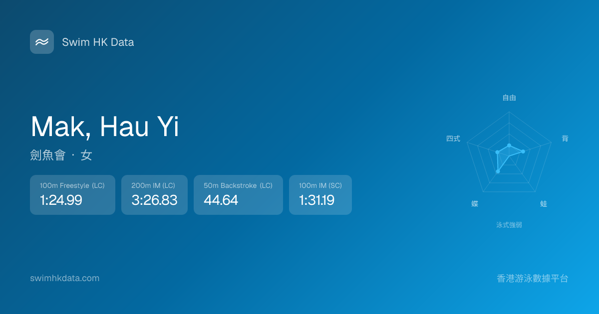此圖表根據你所有比賽成績計算,顯示你在各泳式的相對強弱,僅供參考。繼續努力,每一次練習都會讓你更快更強!💪