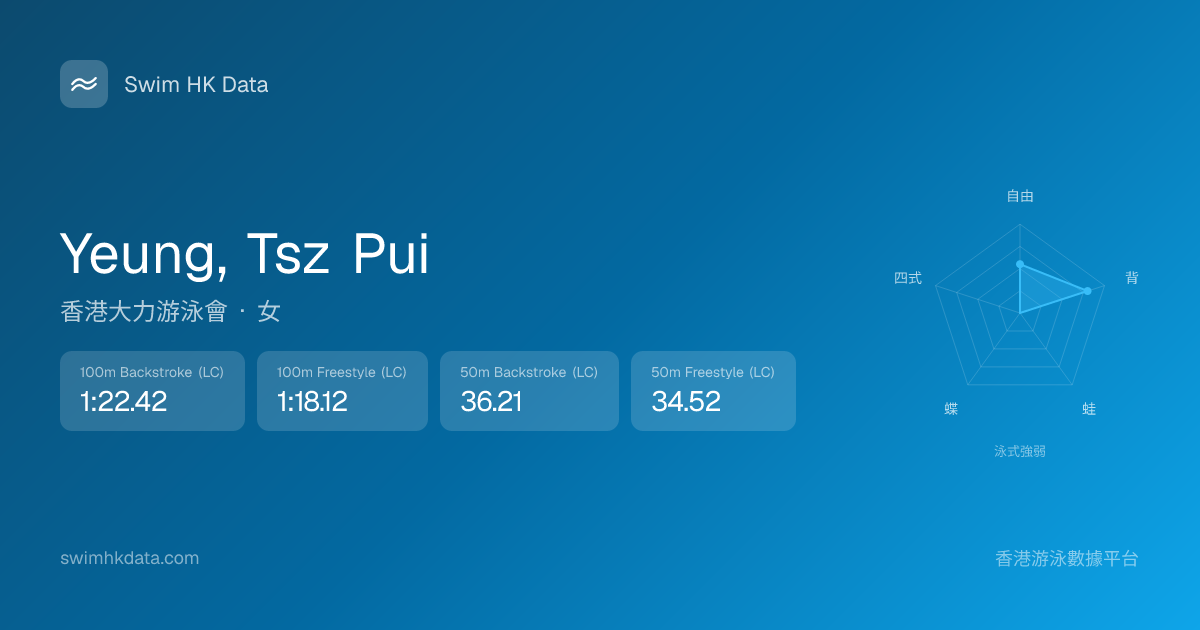 此圖表根據你所有比賽成績計算,顯示你在各泳式的相對強弱,僅供參考。繼續努力,每一次練習都會讓你更快更強!💪