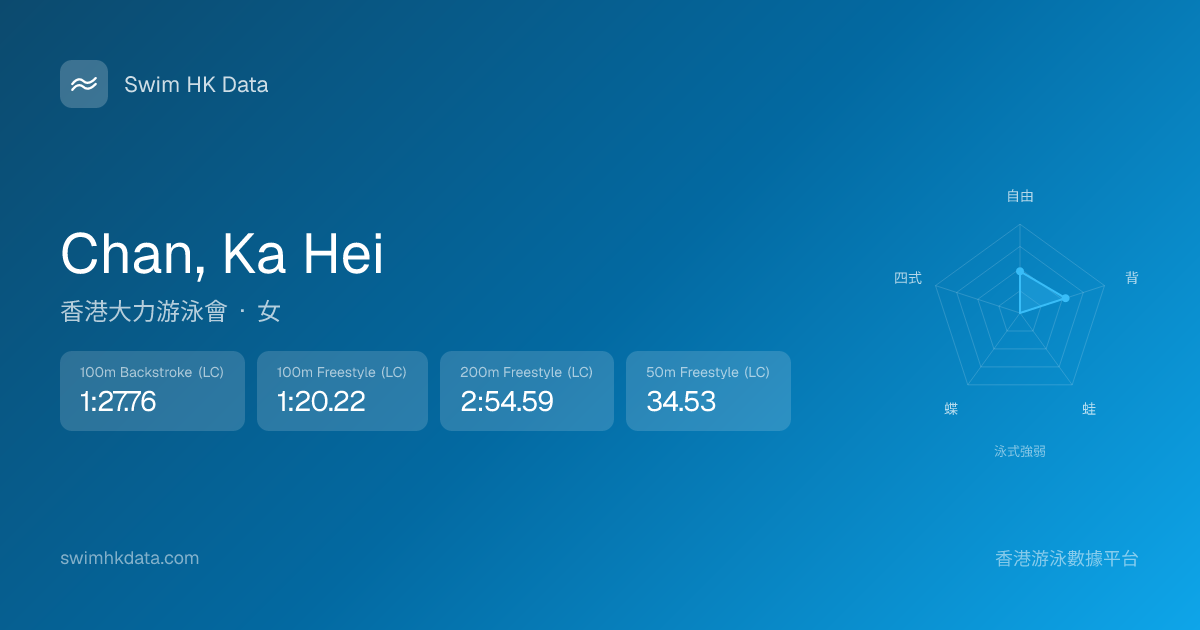此圖表根據你所有比賽成績計算,顯示你在各泳式的相對強弱,僅供參考。繼續努力,每一次練習都會讓你更快更強!💪