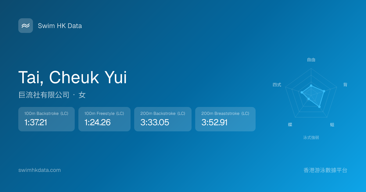 此圖表根據你所有比賽成績計算,顯示你在各泳式的相對強弱,僅供參考。繼續努力,每一次練習都會讓你更快更強!💪