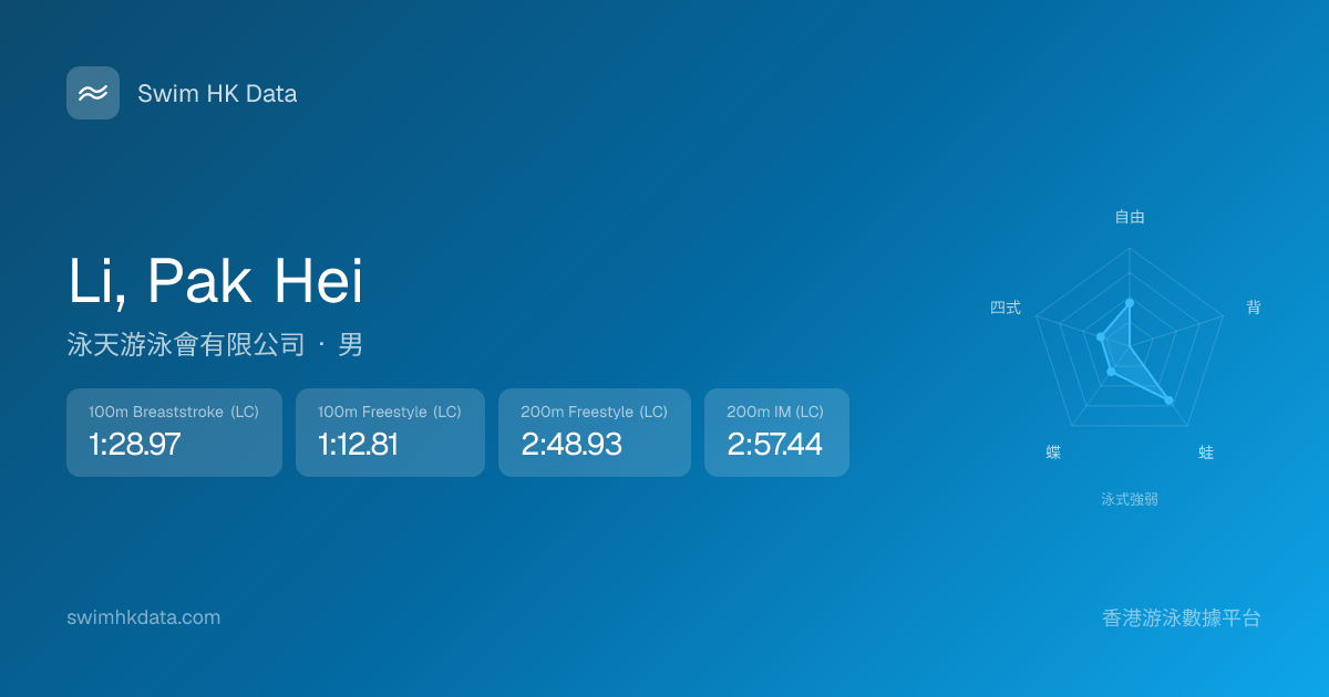 此圖表根據你所有比賽成績計算,顯示你在各泳式的相對強弱,僅供參考。繼續努力,每一次練習都會讓你更快更強!💪