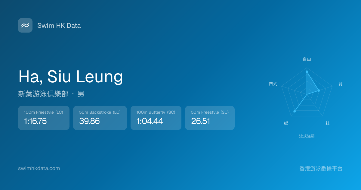 此圖表根據你所有比賽成績計算,顯示你在各泳式的相對強弱,僅供參考。繼續努力,每一次練習都會讓你更快更強!💪