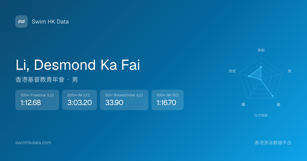 此圖表根據你所有比賽成績計算,顯示你在各泳式的相對強弱,僅供參考。繼續努力,每一次練習都會讓你更快更強!💪