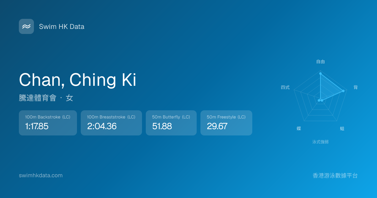 此圖表根據你所有比賽成績計算,顯示你在各泳式的相對強弱,僅供參考。繼續努力,每一次練習都會讓你更快更強!💪